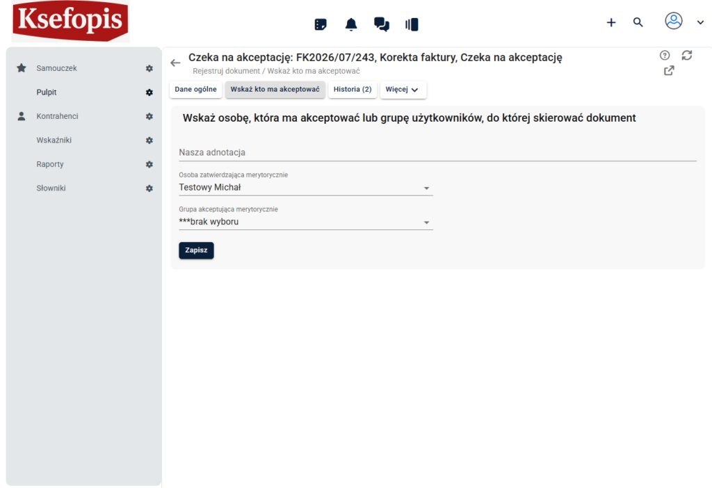 Zależnie od ustawień w Ksefopisie dokument może czekać jeszcze na drugą akceptację – finansową. Wtedy wyświetli się na pulpicie osoby, która jest za to odpowiedzialna.