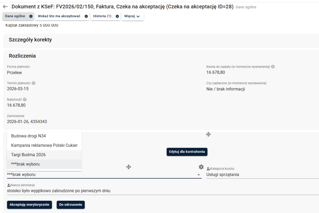 Jeśli jesteś wybrany jako osoba zatwierdzająca merytorycznie dokument, musisz podjąć decyzję – czy akceptujesz dokument, czy jako firma chcesz go odrzucić.