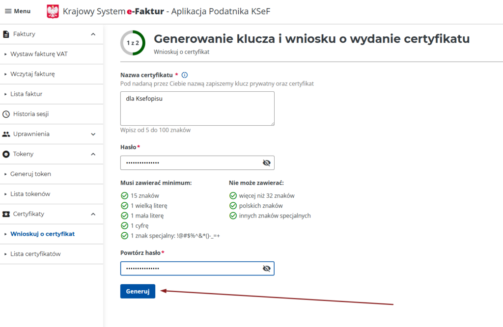 2. Wygeneruj certyfikat KSeF w aplikacji podatnika