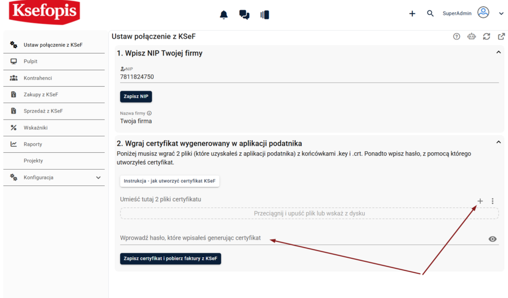 3. Wprowadź w Ksefopisie NIP swojej firmy i certyfikat